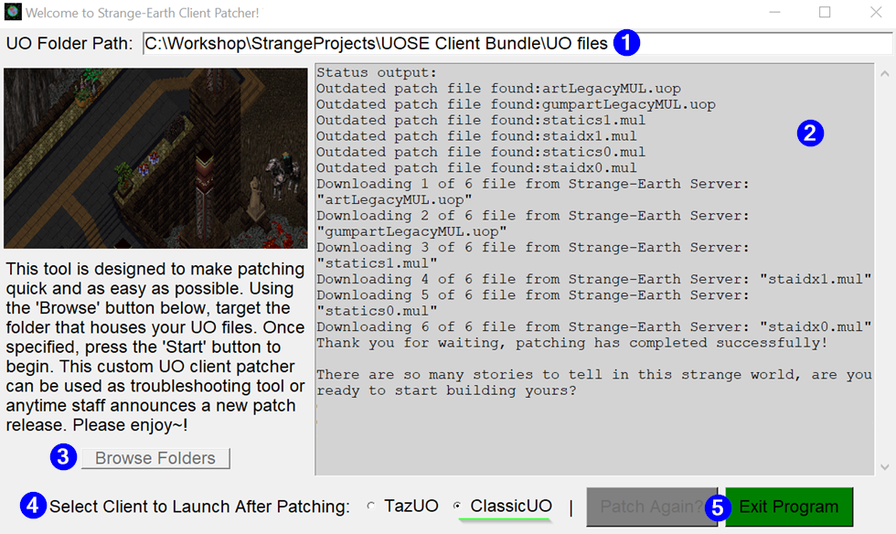 Greetings Strange-Earth Adventurers, With the seasons changing, so does our in-game content! As we transition into fall, beware of the eerie atmosphere across the shard. If you die anywhere on Strange-Earth UO (UOSE), your corpse now has a chance to be resurrected in a random graveyard. Track down and slay your resurrected corpse for a chance at random rewards! Additionally, the Fall area in Malas is now open. This region leads to mines, a town, and a dungeon. Be sure to explore the area as new secrets may await you. The Fall voting area is still under construction, but I expect to publish it within the next day, so stay tuned! Regarding the ClassicUO client, recent restructuring has caused some in-game display issues. Until a stable version is released, I recommend rolling back to version 1.0.0.0. To do so, select client backups and apply this version, but remember to close all Ultima Online clients on your computer before proceeding. (See screenshot) Other Updates: